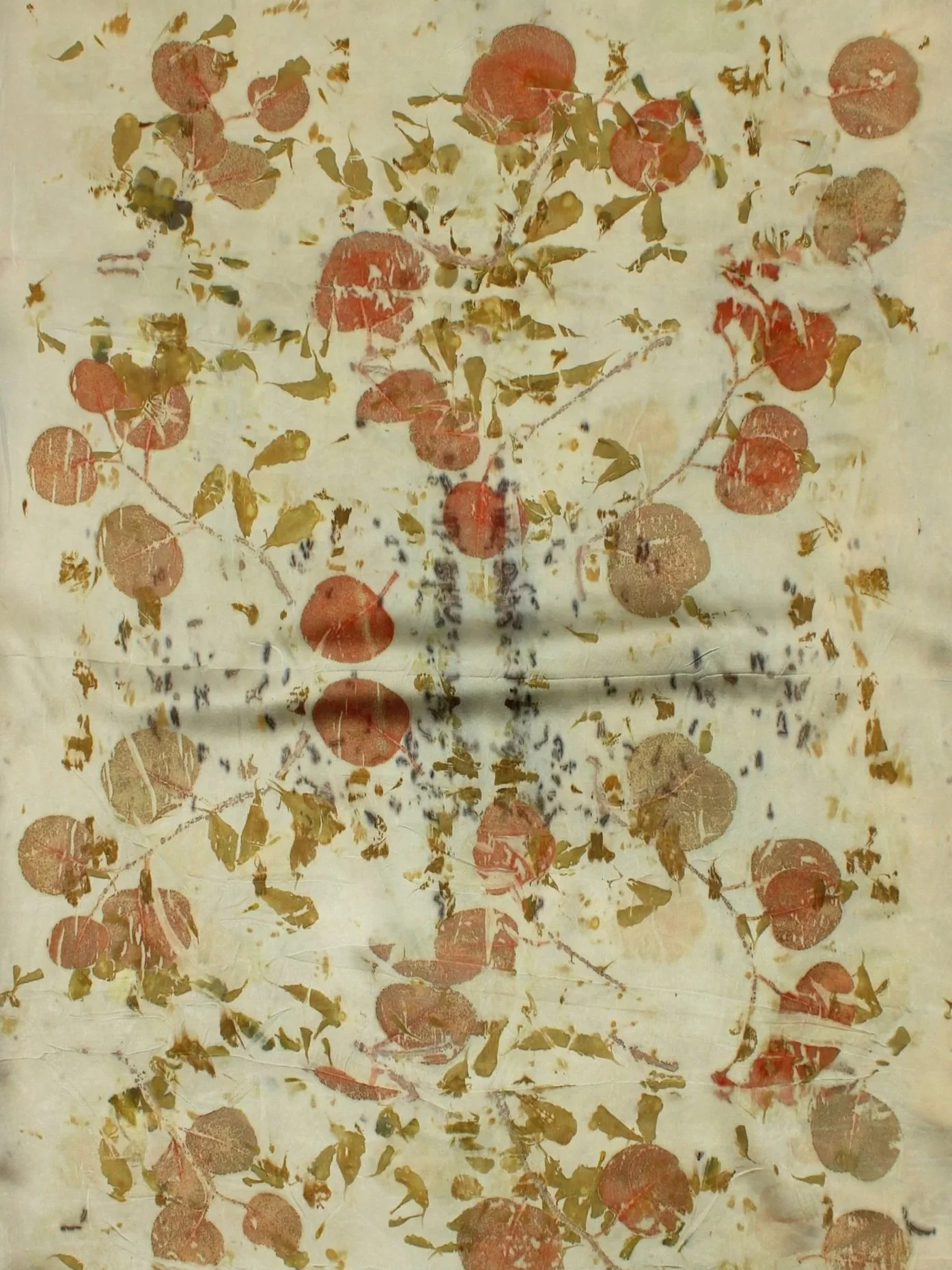 Below you’ll find four samples of eucalyptus printed on silk/wool voile. You’ll notice that even when using a barrier of painters plastic, the eucalyptus had the power to print through the plastic— which is why there are ghost prints of leaves, especially in the first sample. The sample printed with an iron blanket does not have ghost prints due to the fact that there was an additional layer of fabric blocking further penetration. Eucalyptus is so full of tannin that you can reuse leaves that you have already printed with until they have no more pigmentation— or in turn, you could make a tannin-rich bath by simmering the used leaves.