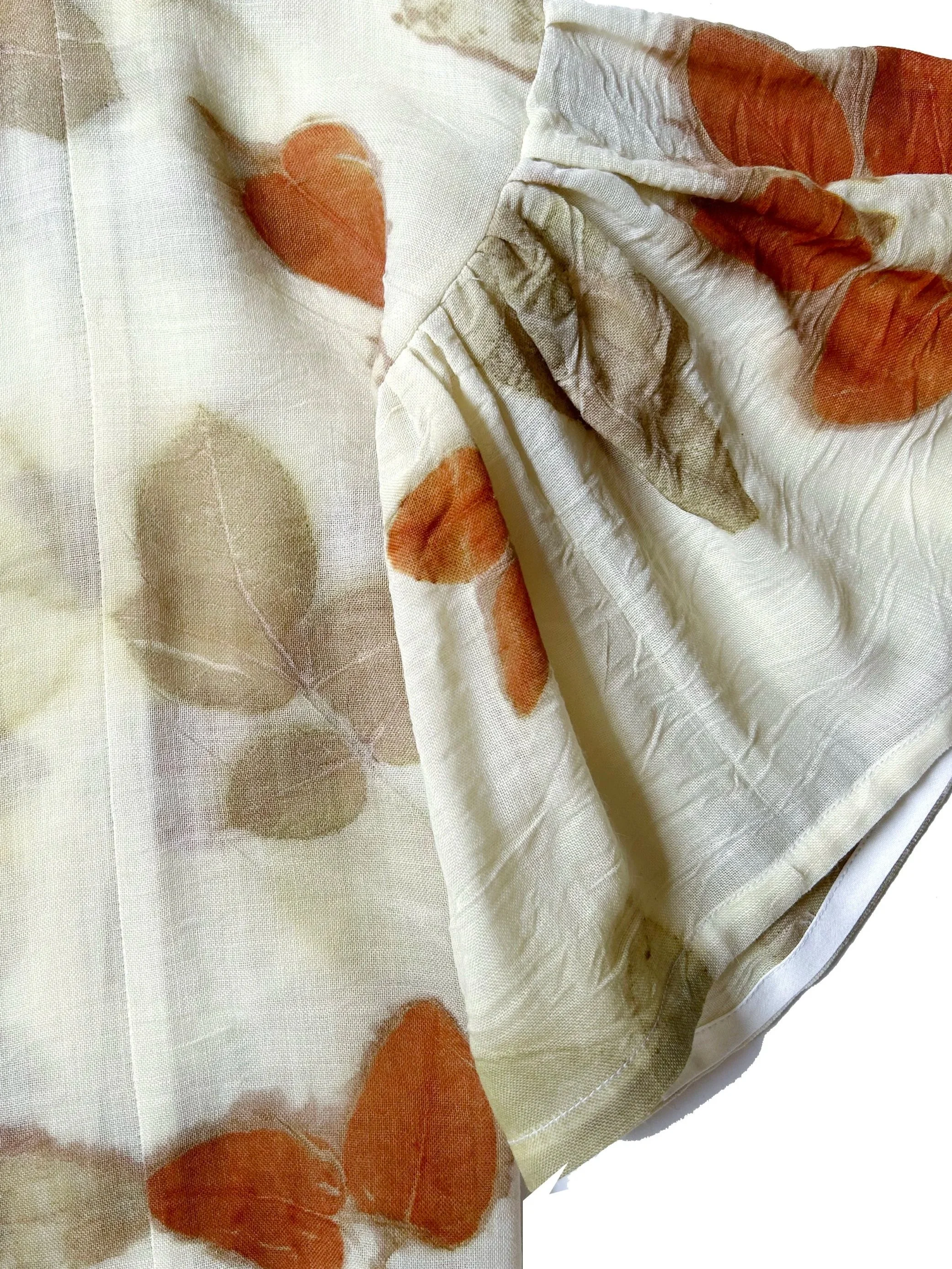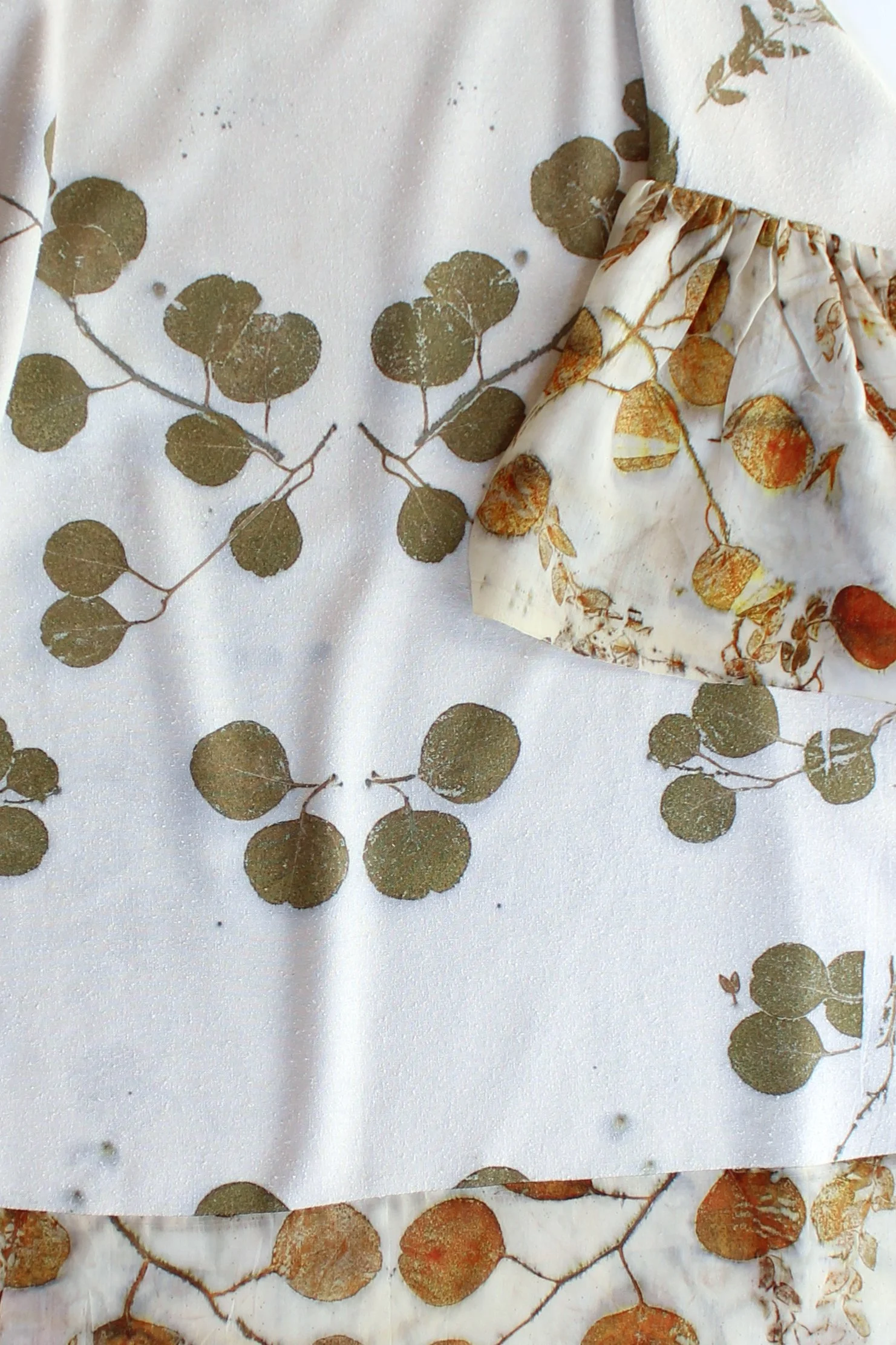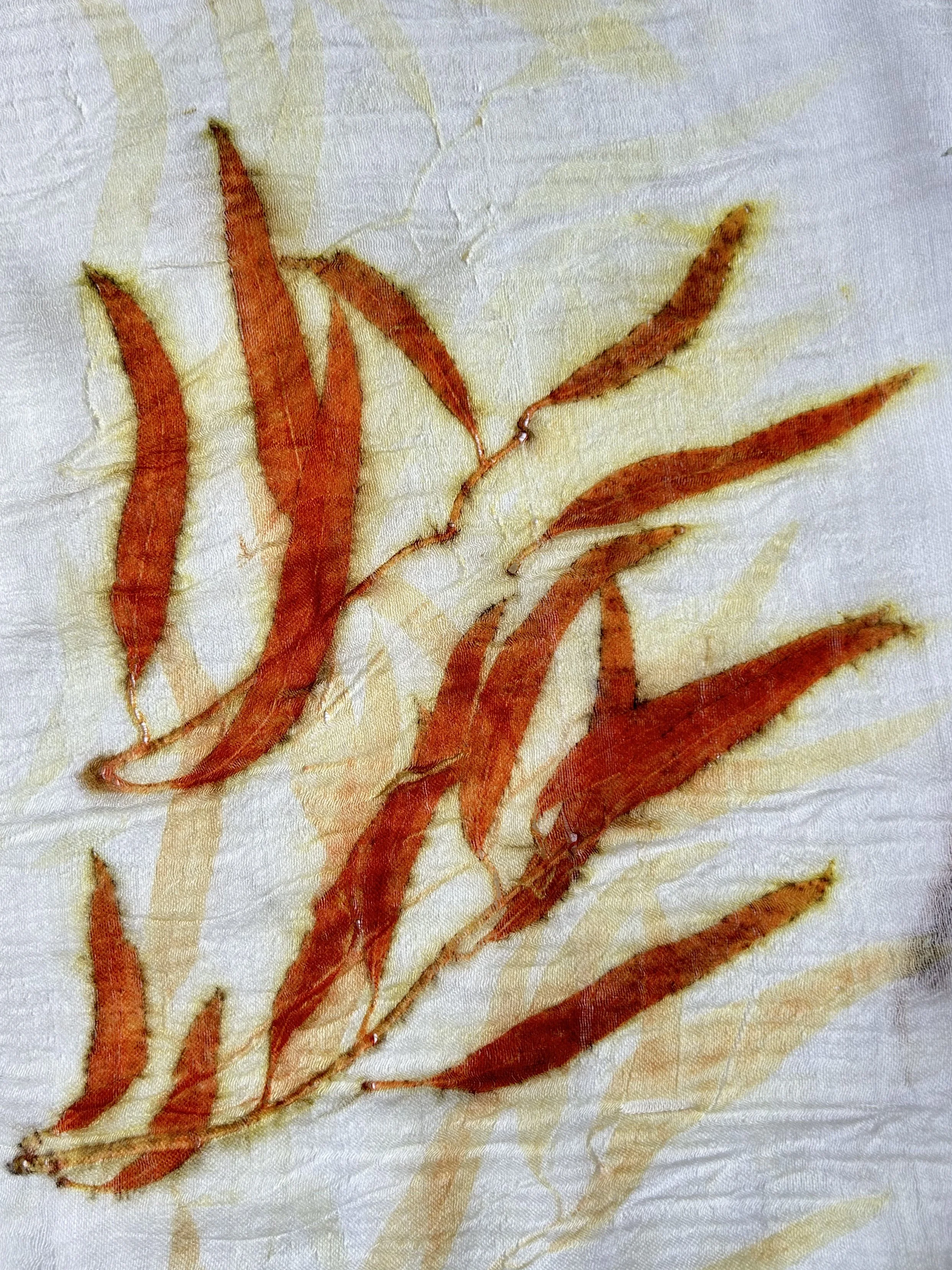 Eucalyptus and protein fibers are a match made in heaven. You can actually print both silk and wool with eucalyptus leaves without any mordant or modifier. Surprisingly with wool, when using no mordant at all, the most vivid red vermillion can be achieved. The dress pictured ABOVE features raw silk noil used for the body of the dress and a silk/wool blend for the gathered sleeve— notice how the same leaves print orange on the wool and green on the silk?