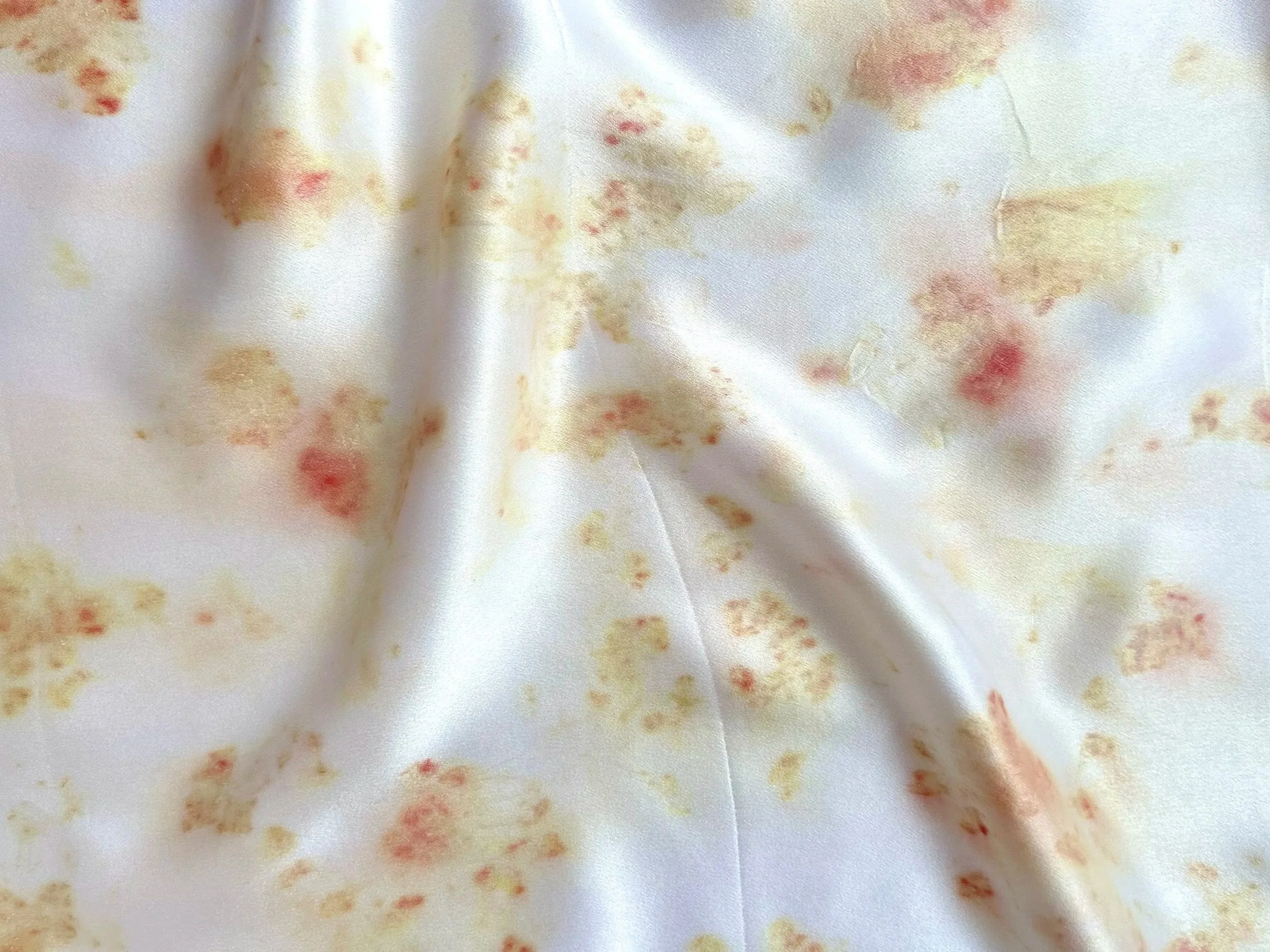 At Flora Obscura, each silk pillowcase and robe begins as a blank canvas. Real blooms — marigold, cosmos, hibiscus — are placed upon the fabric, bundled, and steamed in a ritual that coaxes their pigments to release and bond with the silk. This process, known as botanical contact printing, transforms nature’s fleeting color into something lasting yet alive.