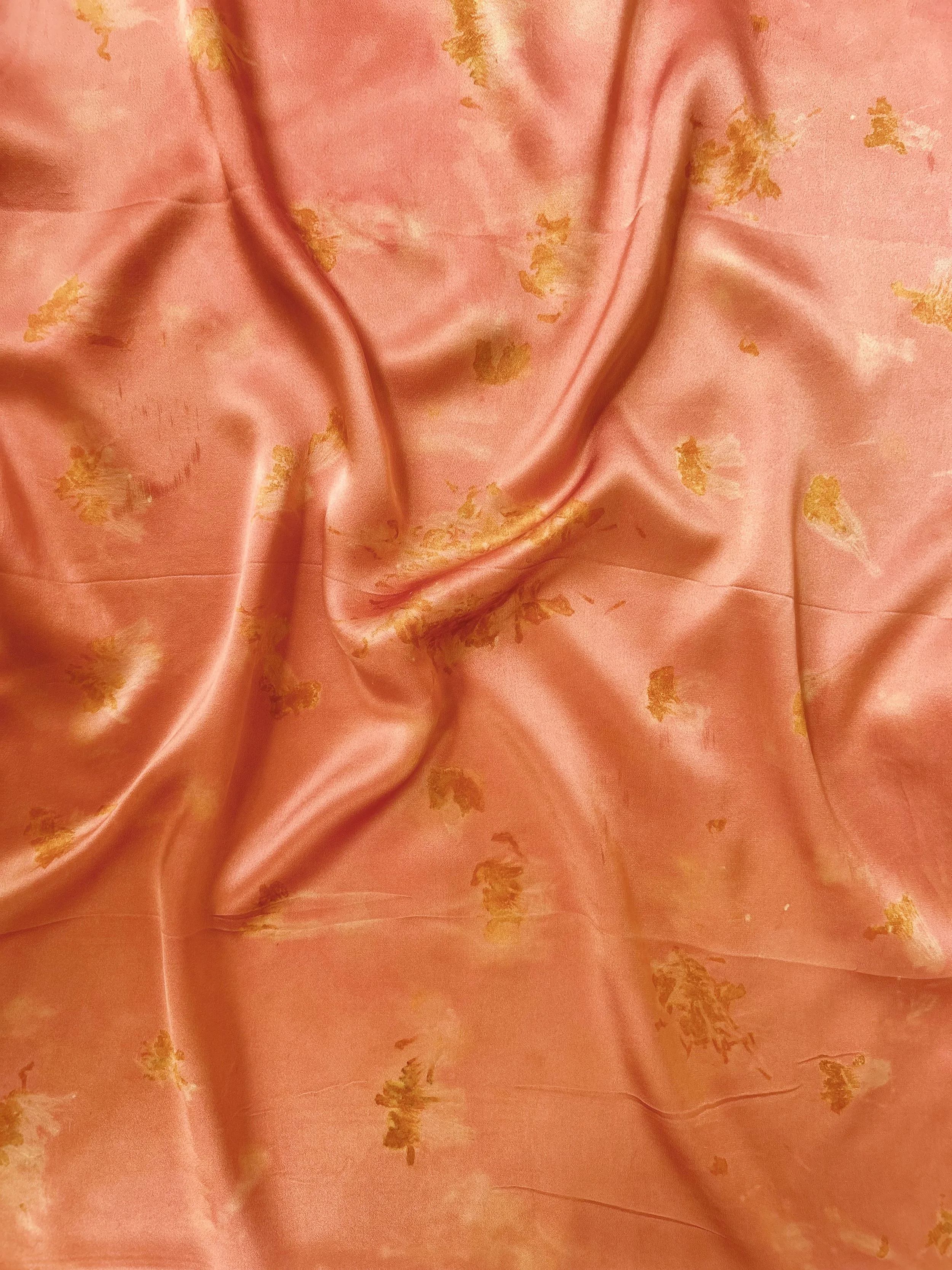 Pure 22mm mulberry silk charmeuse naturally dyed and botanically contact-printed with pure botanicals.
