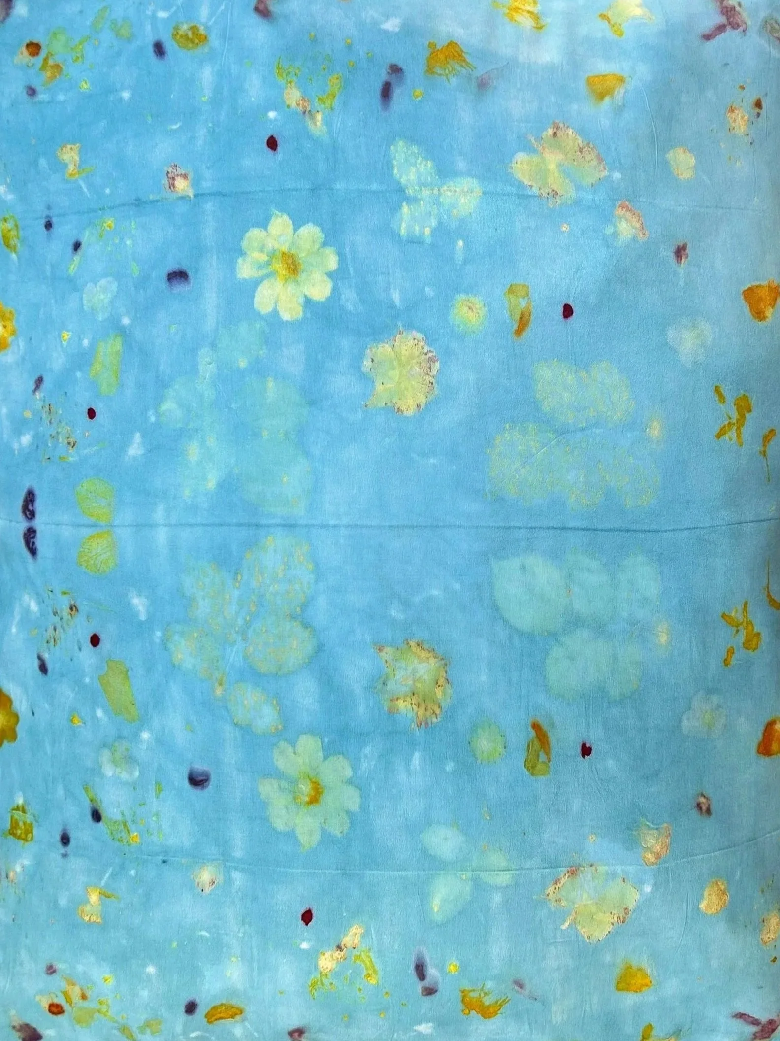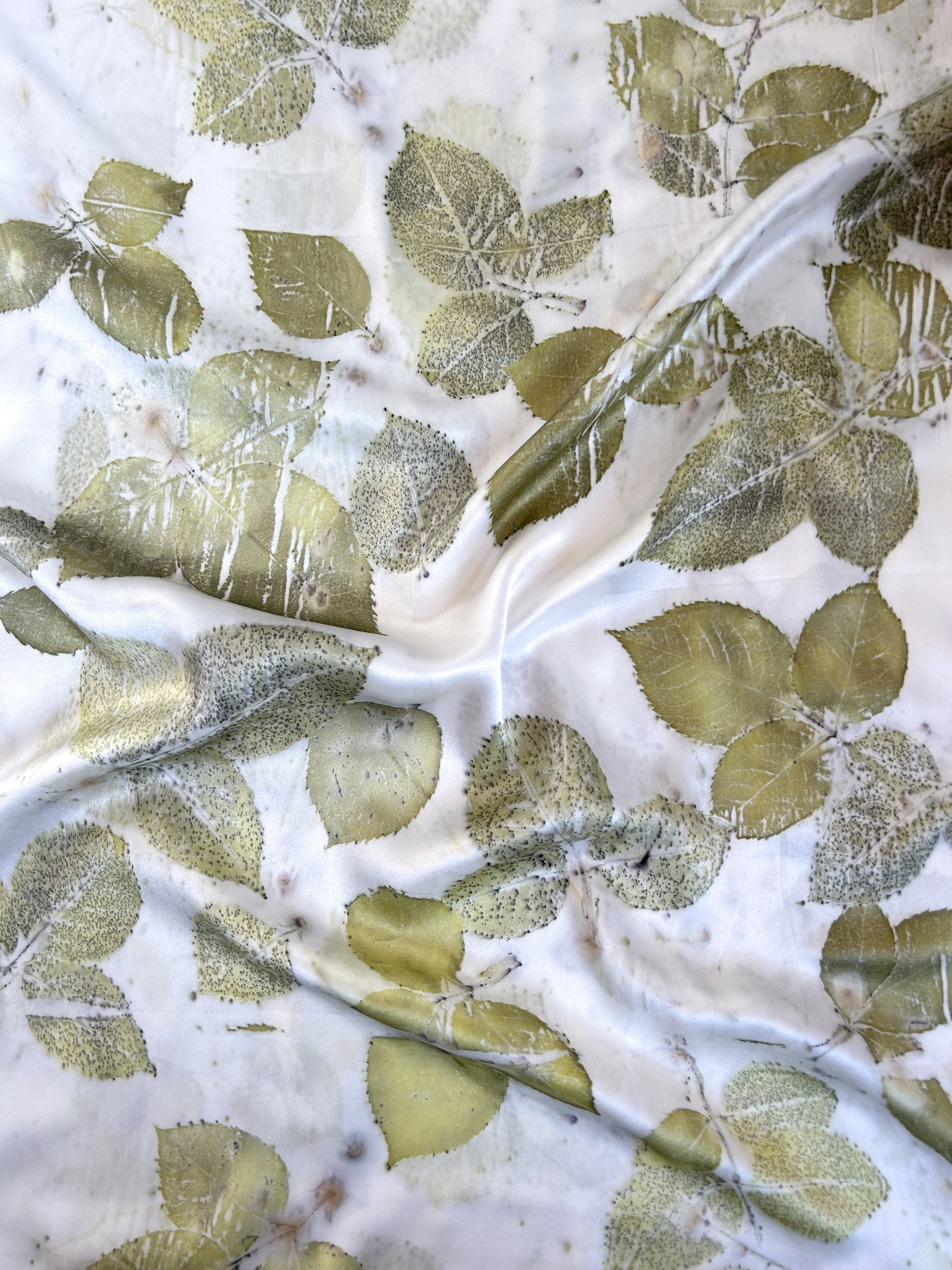 Pure 22mm mulberry silk charmeuse naturally dyed and botanically contact-printed with pure botanicals.
